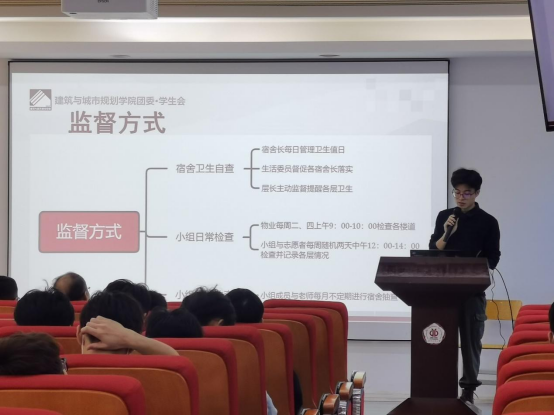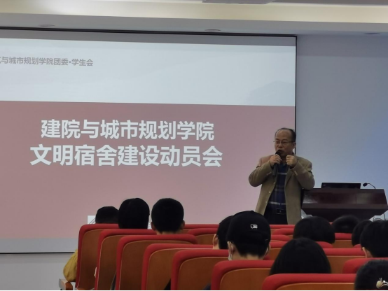 会议首先由党委副书记李晓伟老师发言。李晓伟老师先对男生宿舍4栋的建设情况进行总结,并重点对21级的卫生工作进行了表扬:21级的同学们虽然住在八楼,但楼道走廊卫生依然保持良好,坚持每天垃圾下楼,宿舍门口干净整洁。随后老师表达了校方与团学对本次活动的高度重视:建院团学新设宿舍小组全员将帮助同学们建设宿舍,起到引导与监督作用。团学还将携手青志帮助宿舍小组完成工作。活动全程还有辅导员贾朝强老师亲自更进。最后,老师对本次活动的开展表达了殷切希望,希望全体参会人员共同管理好大家的住宿环境。