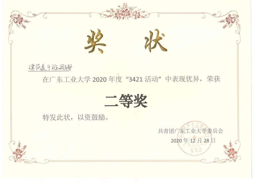 12月28日,学院在校团委举办的“3421”总结活动评选中获得优秀组织奖,学院20级建筑类(4)班团支部获得二等奖。