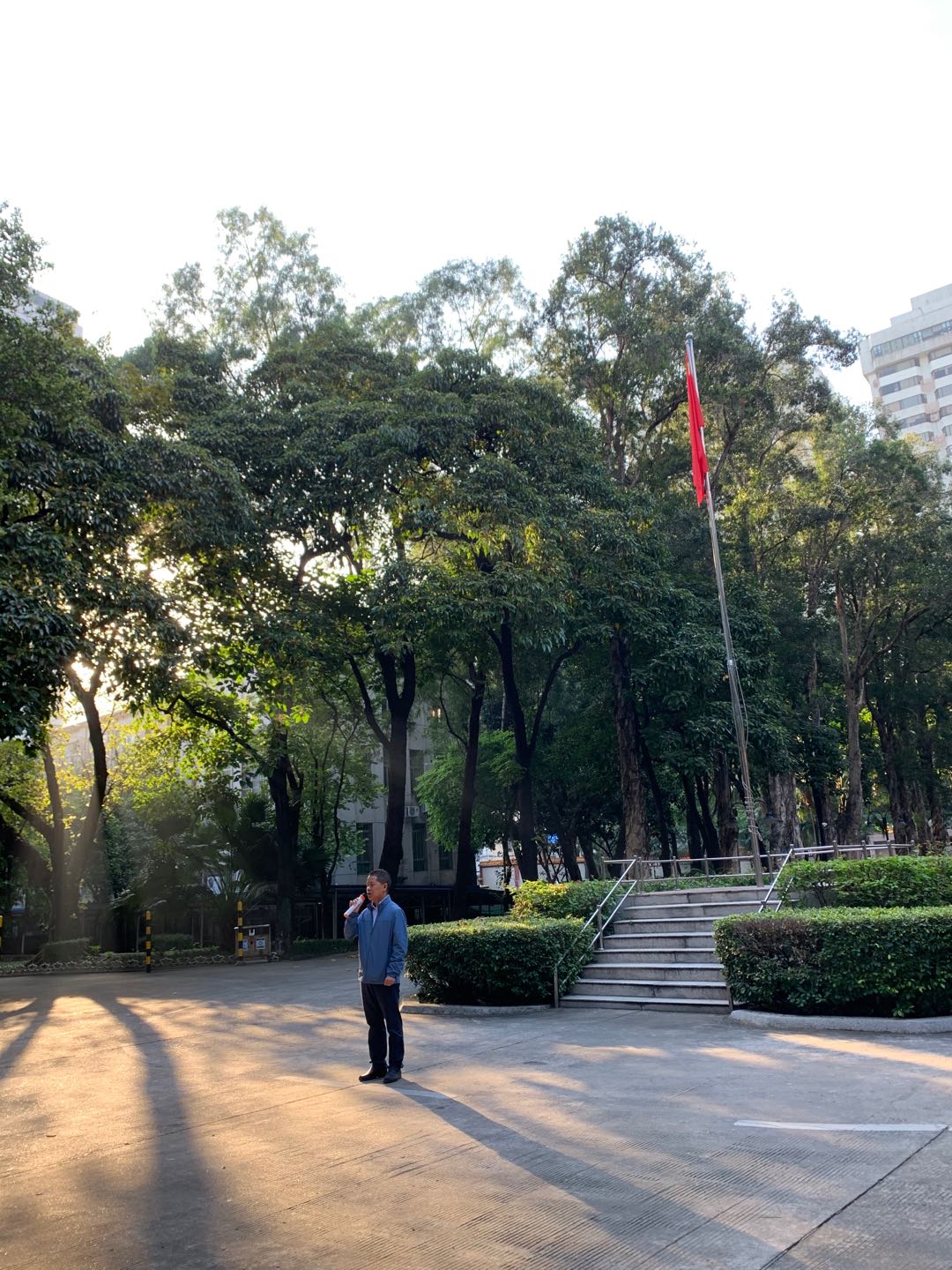 鲜艳的五星红旗在嘹亮的国歌声中冉冉升起,现场全体师生怀着自豪的与激动的心情凝视着迎风飘扬的五星红旗,心中充满无限敬意。