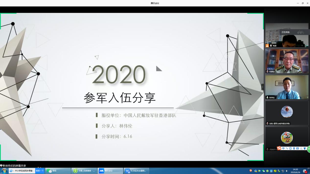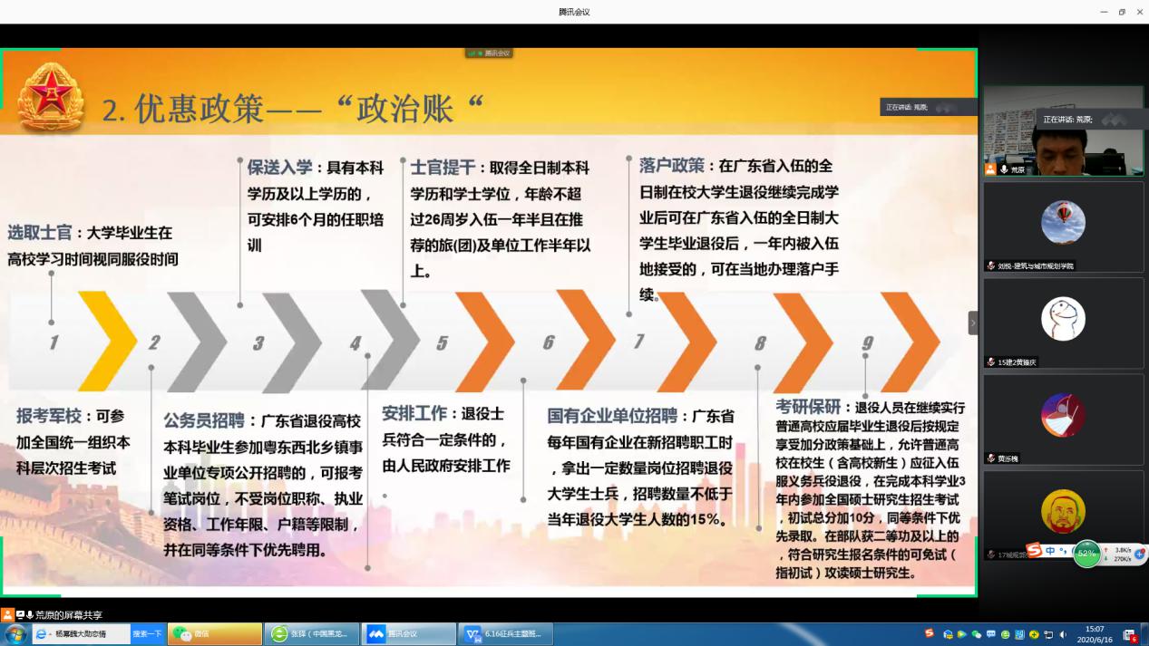 召开2020年大学生参军入伍线上联合主题班会,邀请武警警官学院何建军教授作征兵动员报告。参军退役大学生代表林伟伦、麦毅成,学院党委副书记李晓伟、学院团委书记刘悦和age动漫