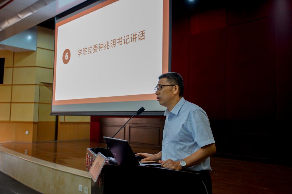 最后,钟兆明书记向2019级全体新生表示衷心的祝贺和热烈地欢迎,同时也对大家寄予厚望。钟书记倡议同学们首先要树立远大的人生理想,钟书记引用习近平总书记的话说:“没有理想信念,就会缺钙,就会得软骨病。”希望同学们不忘初心,牢记使命,把自己的人生价值主动融入到民族振兴和国家进步之中。二是养成勤思善学的好习惯,主动培养科学精神和创新意识,少争分数之多寡,多问学问之有无。三是学会做人做事,钟书记引用陶行知先生所说:“千教,万教,教人求真;千学,万学,学做真人。”钟书记最后代表学院全体教职工向新生们表示衷心的祝愿。