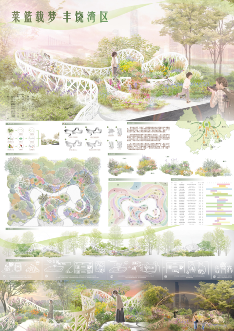 粤港澳大湾区“菜篮子”工程是国家粤港澳大湾区建设中的重要举措,该工程打造了一个高标准的惠民惠商优质农产品服务平台,为大湾区市场提供了丰富、优质的食用农产品。故本花境方案以“菜篮子”工程为设计主题,赞美大湾区的丰饶富足以及湾区政策的惠民福祉。