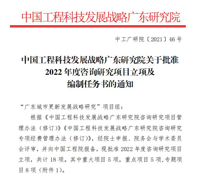 中国工程科技发展战略广东研究院(简称“中工广研院”)咨询研究项目为中国工程院院地合作项目,是为深入贯彻习近平总书记对广东系列重要讲话和重要指示批示精神、在“两院”院士大会和中国科协“十大”重要讲话精神,认真实施《广东省国民经济和社会发展第十四个五年规划和2035年远景目标纲要)》,按照“四个面向”要求, 以支撑中国工程院建设成为“创新引领、国家重、社会信任、国际知名”的国家工程科技高端智库为目标,持续推进的“顶天立地”广东区域高端智库建设而设立的一系列研究课题。