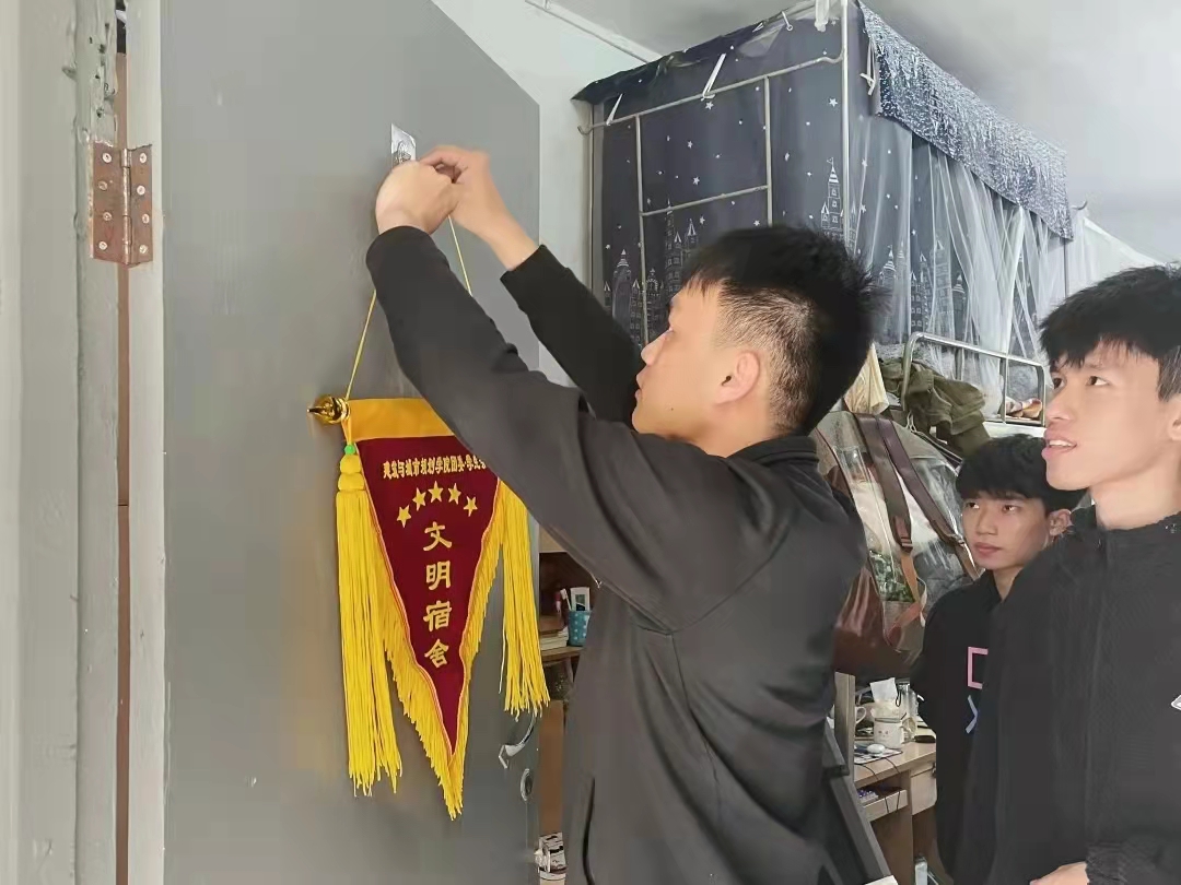 2022年3月10日中午,学生会秘书长贾朝强老师、团委•学生会主席团成员慕容炘其与宿舍小组成员一同前往男生宿舍4栋进行“文明宿舍流动红旗”的颁发,同时对各宿舍进行了防诈骗知识宣传。