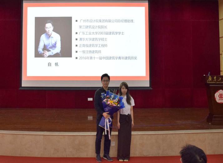 白帆校友作了题为《我心归处是建筑》的分享,白帆向同学们分享了自身学习经历和社会实践经验,并从精神信仰、信念追求、责任担当对师弟师妹们提出了寄语。2022级新生代表黄子桐向白帆师兄进行献花,以示敬意。