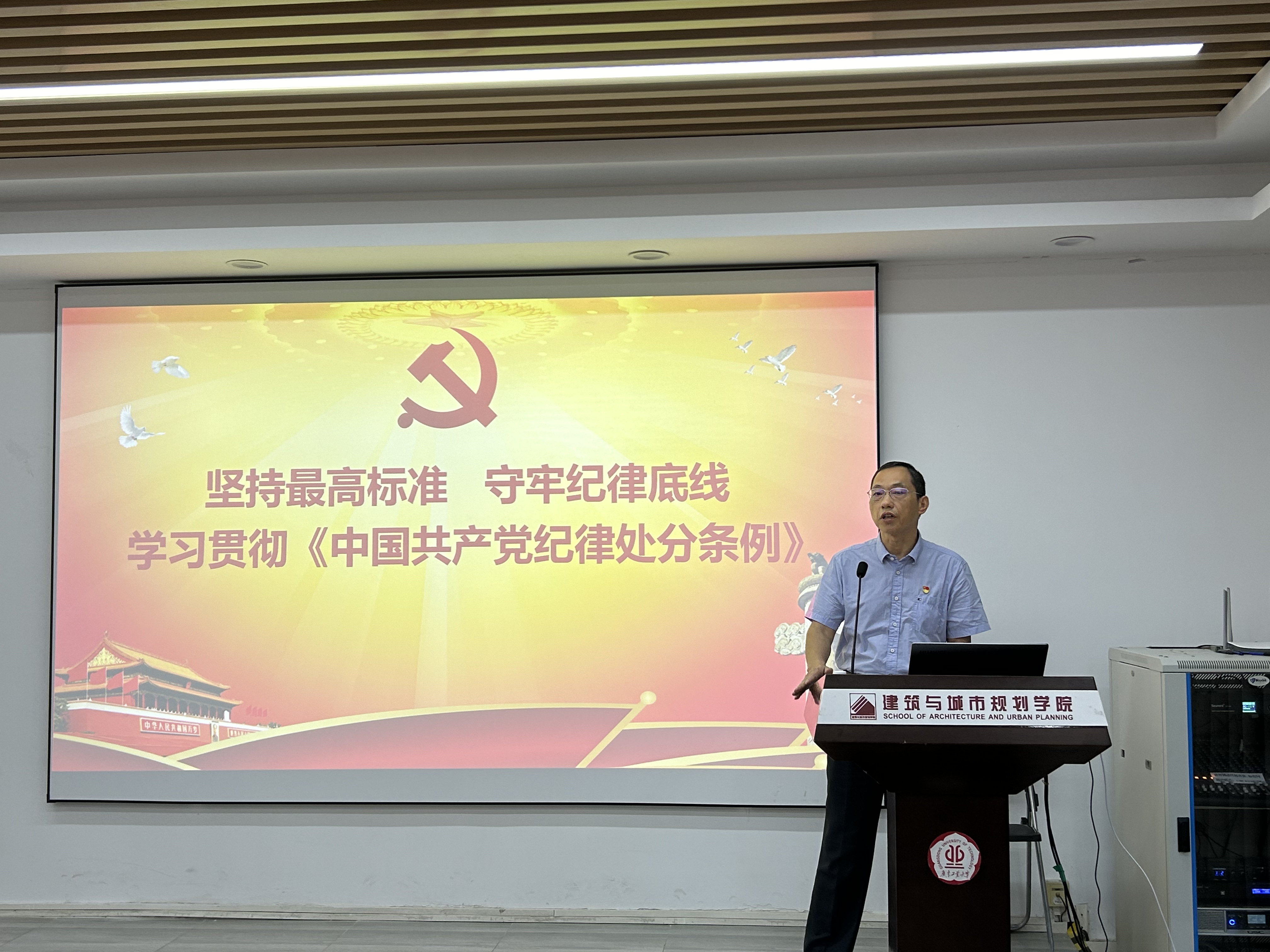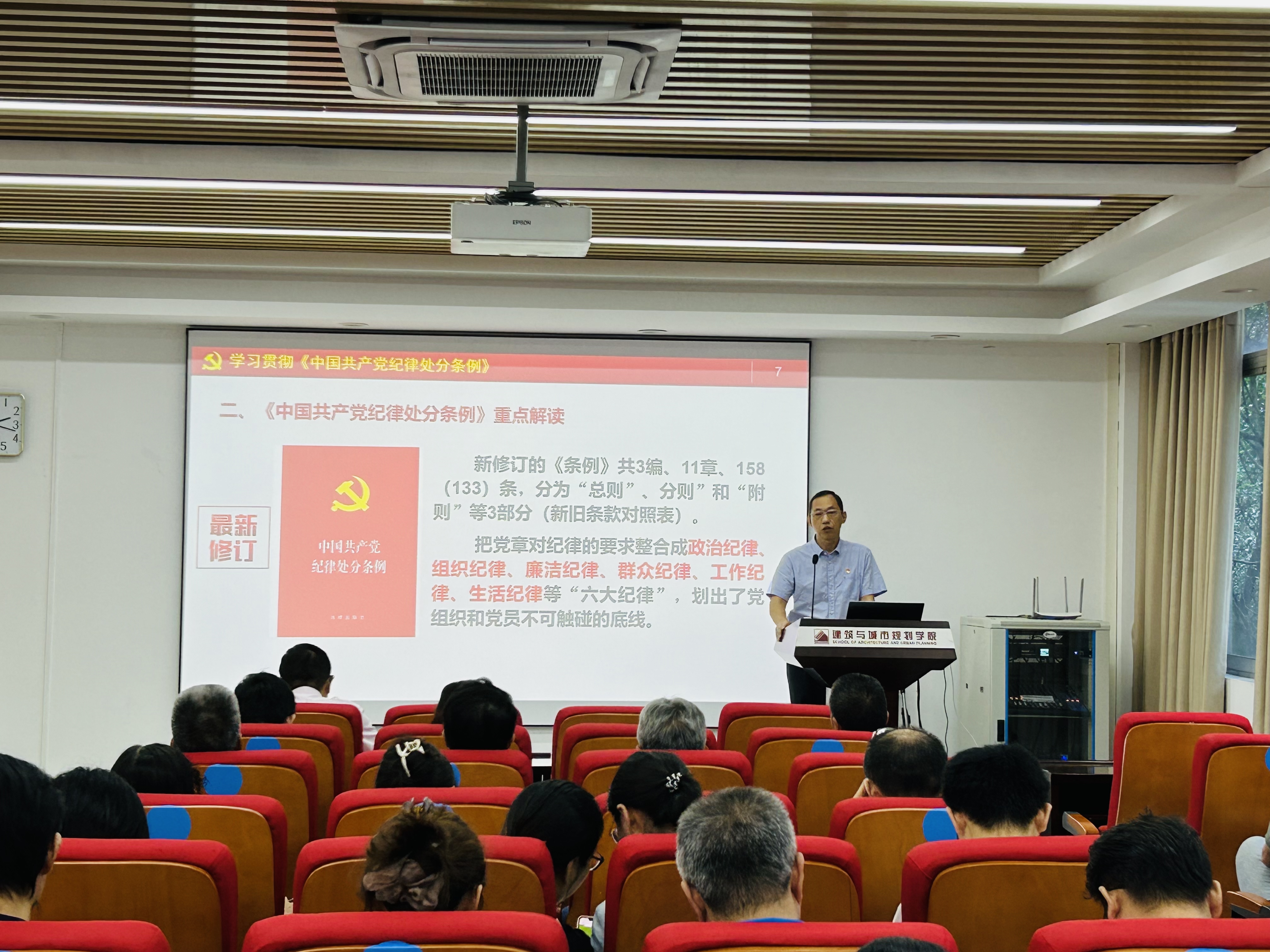 在东风路校区2-314报告厅召开党纪学习专题辅导会暨党委理论学习中心组(扩大)会议。学院党委书记王伟文作题为《坚持最高标准 守牢纪律底线》的辅导报告。学院党委副书记李晓伟主持会议,全体教师党员参会。
