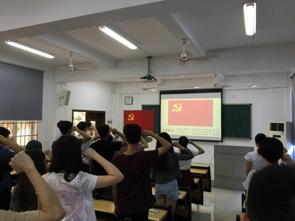 在2号楼314教室举行了新党员宣誓暨2018届毕业生党员宣誓大会,重温入党誓词。学院特邀学院原党委书记杨有强老师,学院关工委副主任、沙河离退休第一党支部书记庄志强老师,学院党委莫卫文副书记,2018届毕业生党员以及本学期新发展党员等参加了此次大会。大会由袁晓聪老师主持。