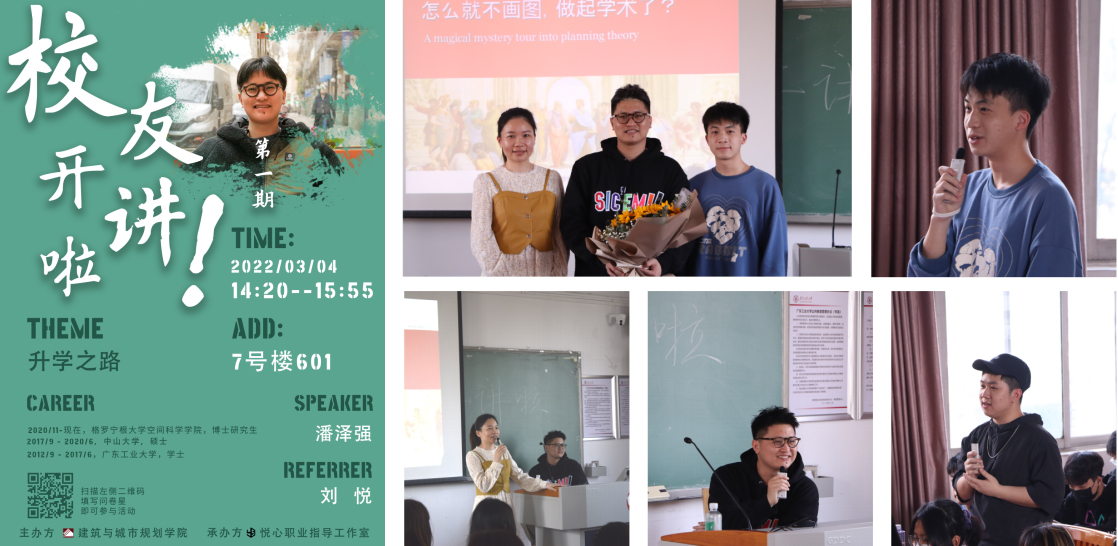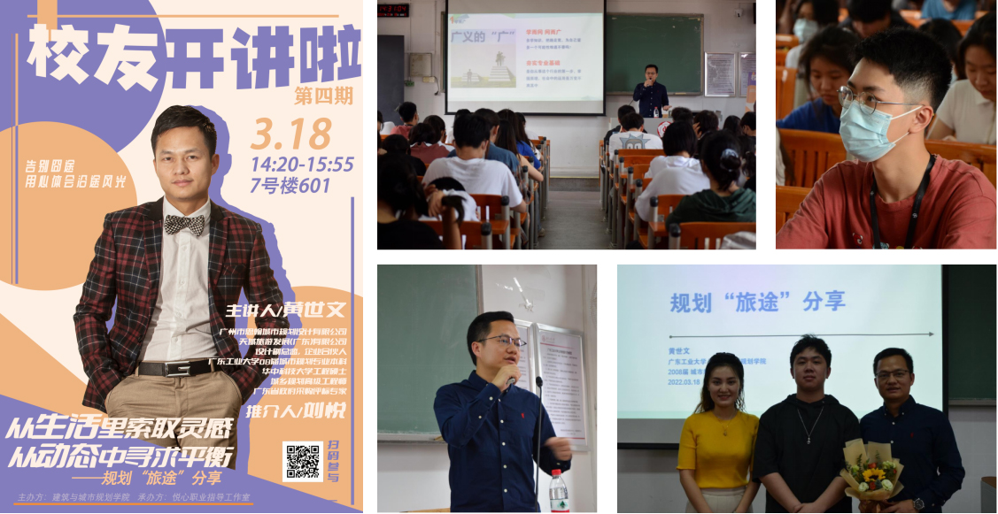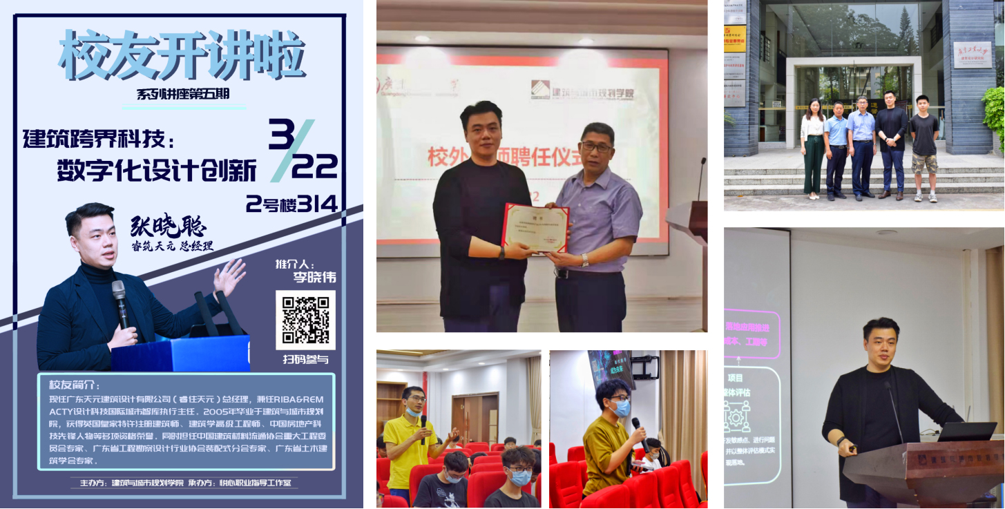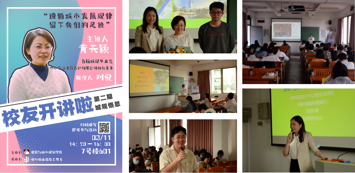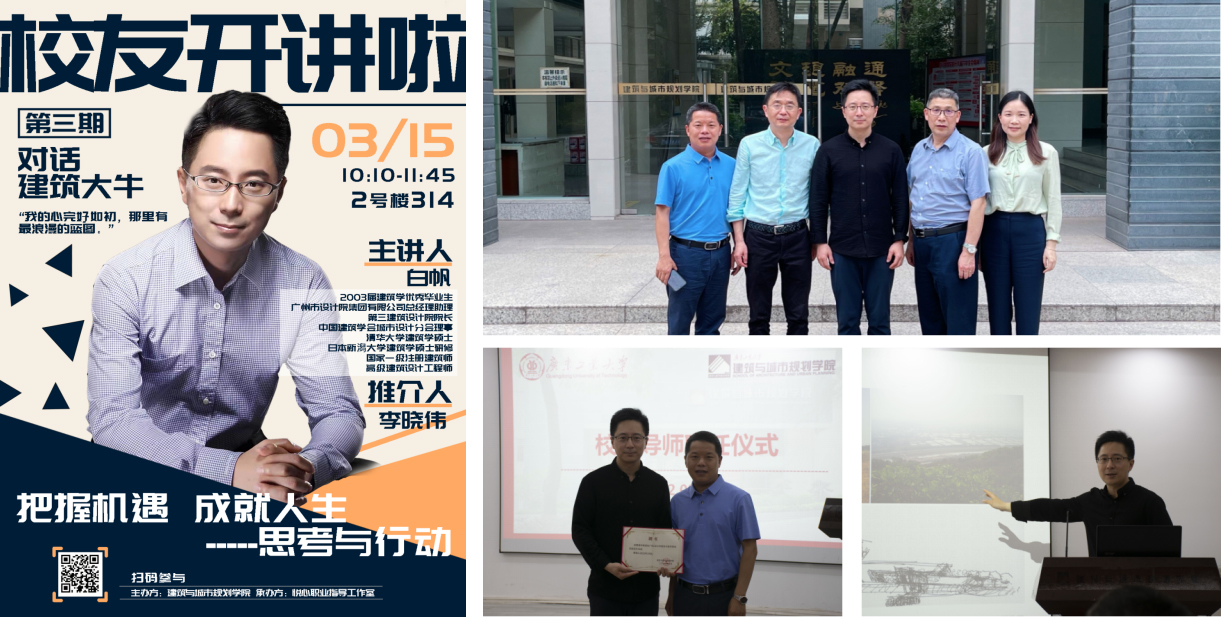 大力引入校友资源,分期分类分主题开展6期《校友开讲啦!》活动,分别邀请广州市设计院集团有限公司总经理助理、第三建筑设计院院长白帆,广东天元建筑设计有限公司总经理张晓聪,广州市睿合建筑设计有限公司执行董事黄天颖,广州宝贤华瀚建筑工程设计有限公司规划总监李杨,广州市思翰城市规划设计有限公司设计总监黄世文,格罗宁根大学博士潘泽强到校与学生交流。