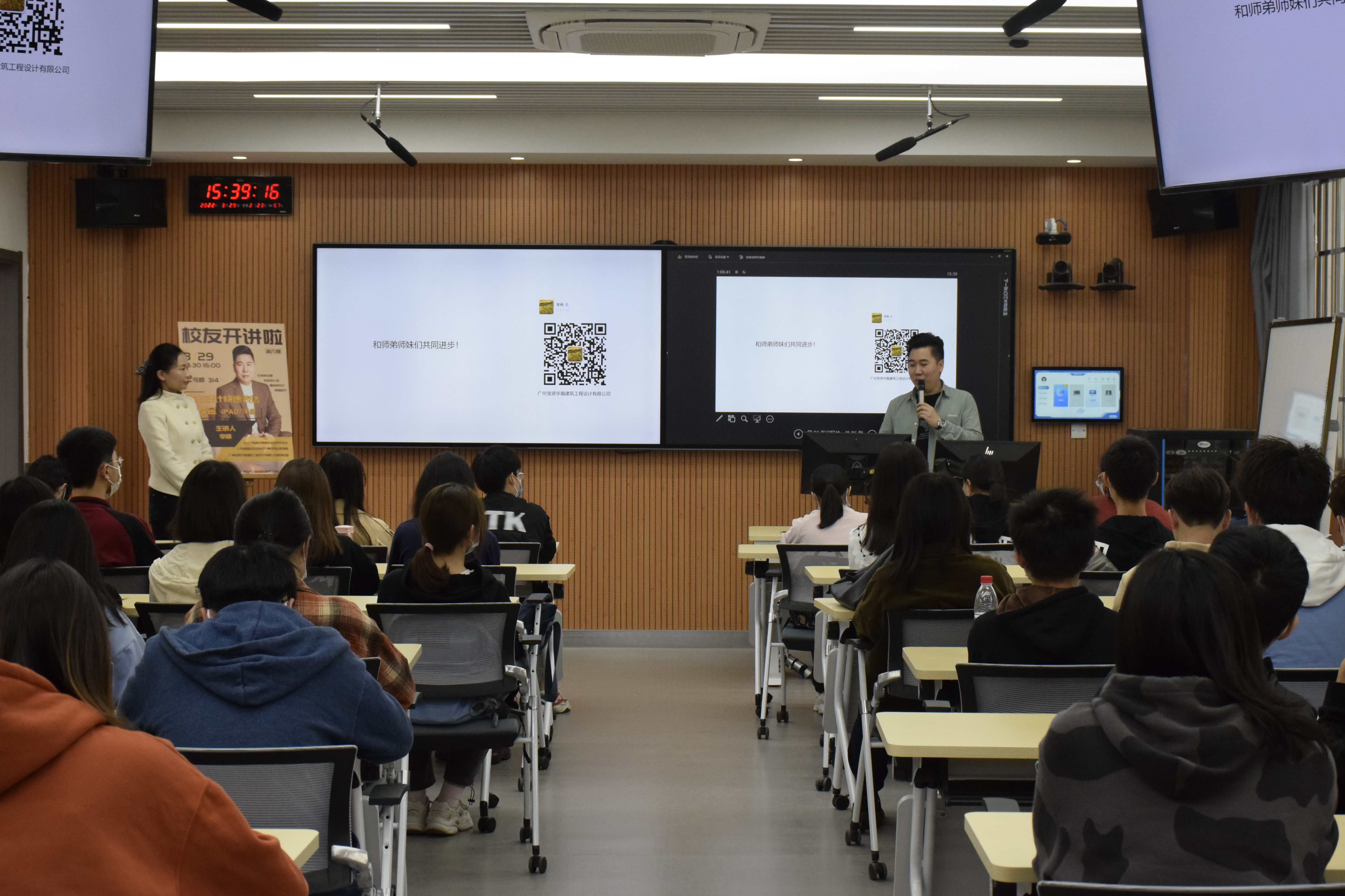 3291420,学院在7号楼808智慧教室举行第六期《校友开讲啦》。学院优秀校友李杨师兄以“城市设计快速表达”为主题,结合自身丰富经验,与同学们分享快题技能,讲述我们应如何具备优秀的规划与设计素养。学院党委书记钟兆明、党委副书记李晓伟出席活动,并代表学院聘任师兄为学院校外导师。本次活动由悦心职业指导工作室承办。