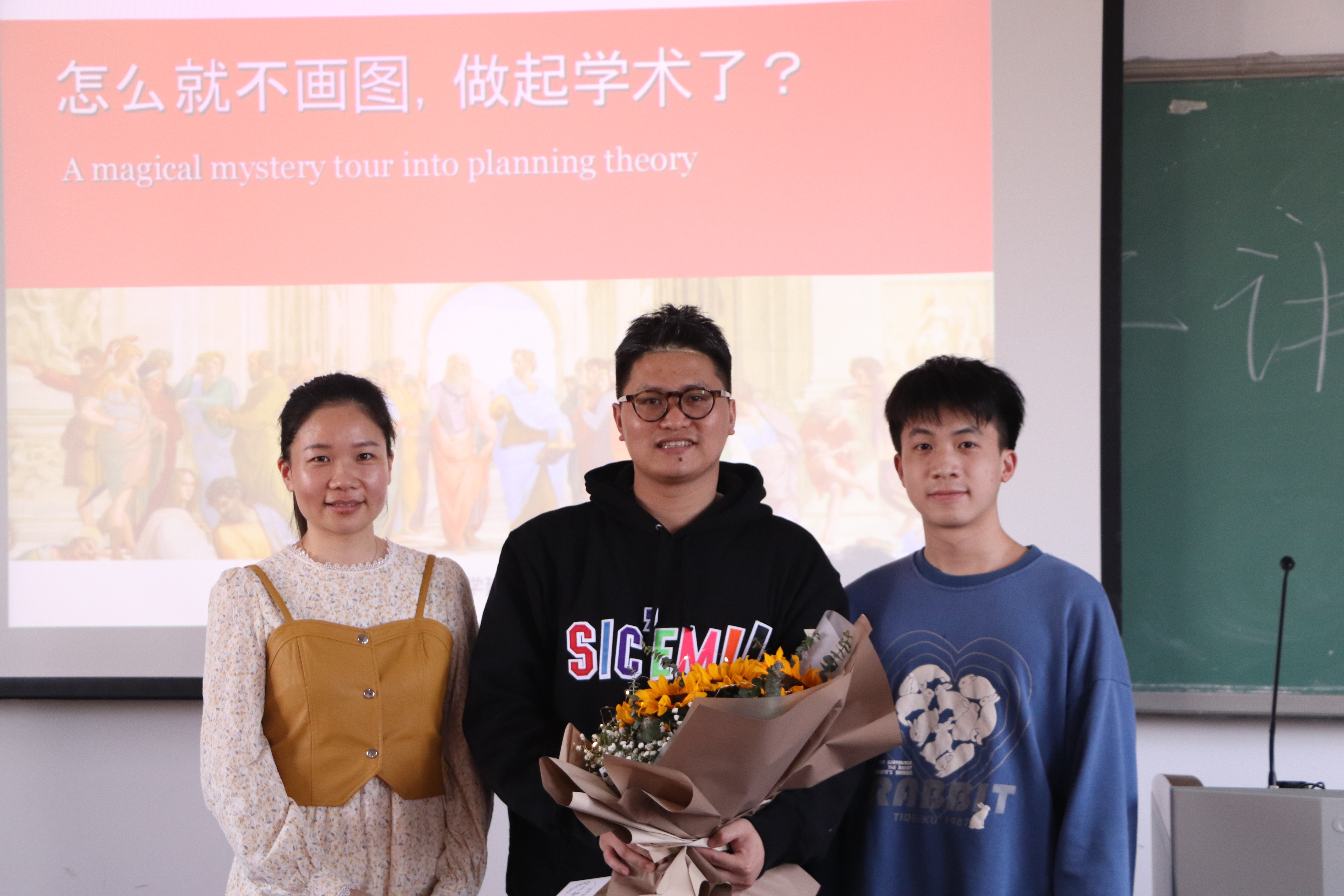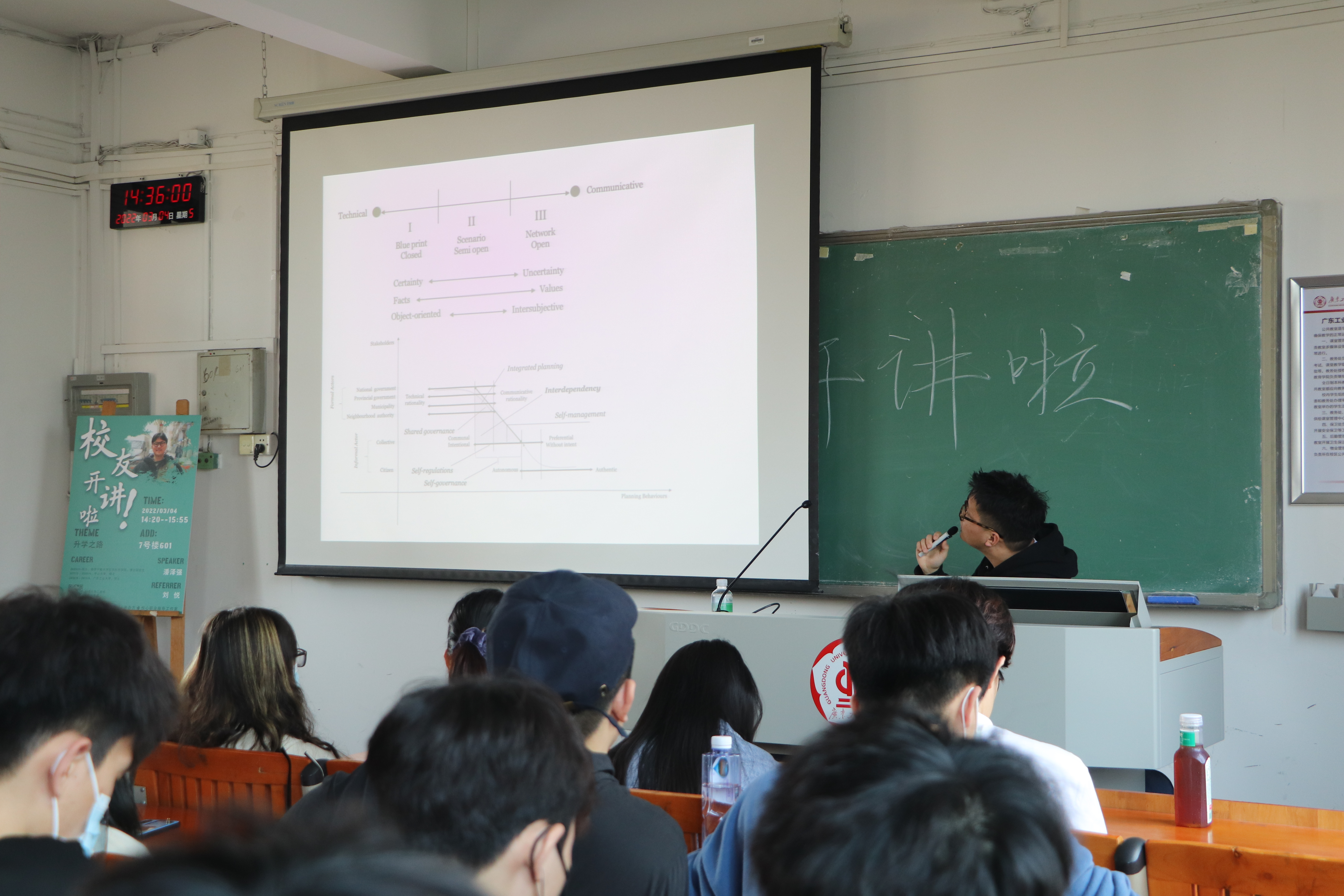 师兄和同学们开展进一步的交流。19级城乡规划(1)班的李天泽同学提出大三、大四的同学如何通过具体的行动提升自己的核心竞争力去考研的问题,潘泽强师兄回答:现阶段认真学好专业课程,遇到问题不退缩;选择方向是非常重要的,在学校的选择上,可以列出院校名称和自己能考上的原因进行针对性的SWOT分析,最终选择最有可能的报考院校。19级城乡规划(1)班的邓非凡同学向师兄请教在近年来考研人数只增不减、考研成常态的情况下,在考研大军中寻找定位的方法。潘泽强师兄建议同学们不要被网络环境和媒体所渲染的压力影响,竞争可能不是真的那么激烈,真正决定考研的时候不要担心和纠结能否考上。刘悦老师补充:要想怎么去考上,虽然客观的情况确实难考。努力成为分子就够了,不要过多关注分母,分母大小关系其实不大。19级风景园林(1)班何晨萌同学提问:是什么契机让师兄摒弃转行念头坚持修读本专业的?师兄回答:因为当我了解我想转向的行业时我发现我已经花了足够多的时间在原来的专业里面,而且这个专业其实还有很多的可能性,可以趁着年轻多去尝试。请记住,转行不是因为不喜欢这些东西,而是有了更好的选择。